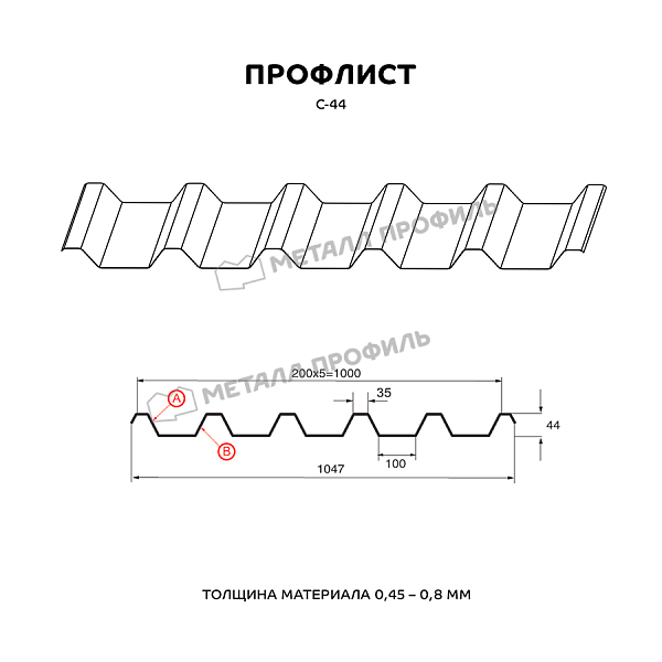 Профлист МЕТАЛЛ ПРОФИЛЬ С-44х1000-B (ПЭ_Д-01-8017-0,45) широко применяется для монтажа кровли. Представляет собой лист оцинкованной стали с покрытием. Общая толщина стальной основы с цинковым и декоративно-защитным слоем — 0.45 мм. После проката на специальном оборудовании металл приобретает рисунок из повторяющихся волн. Несущая способность такого листа на порядок выше плоского.